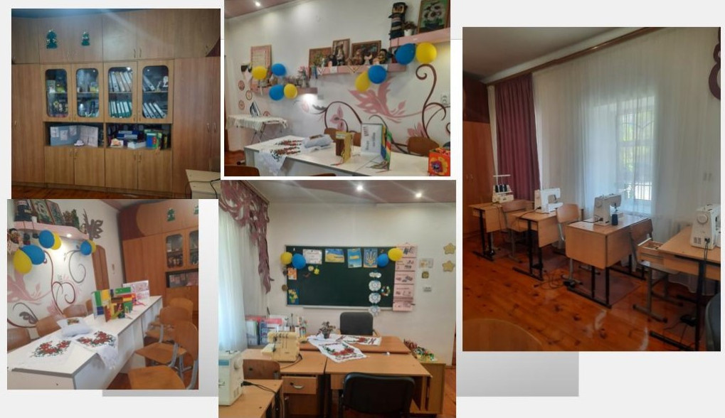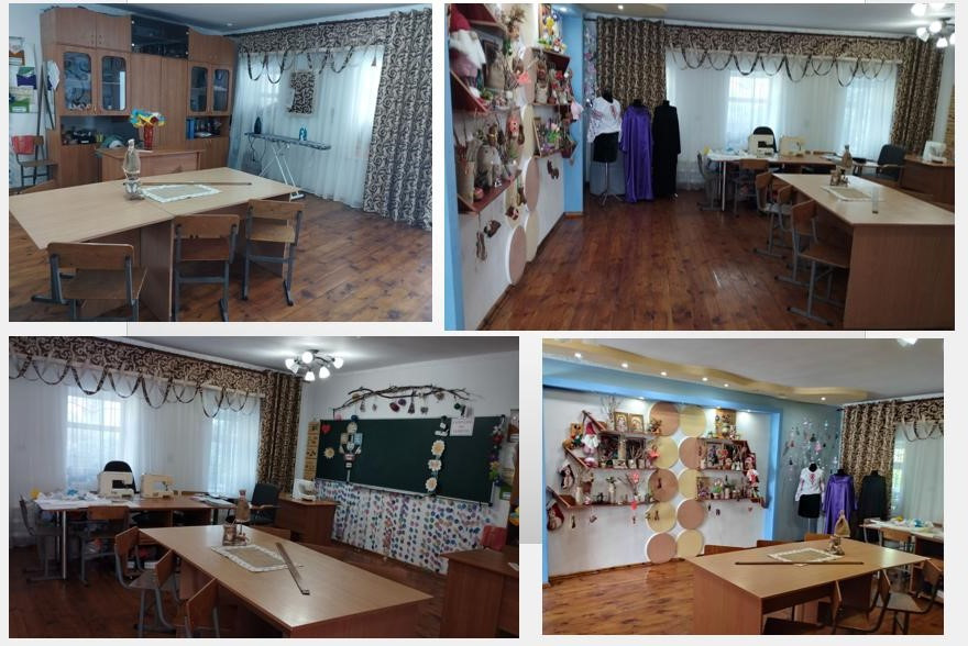 Є 4 майстерні з трудового навчання (шевська майстерня, 2 швейні майстерні, столярна майстерня).